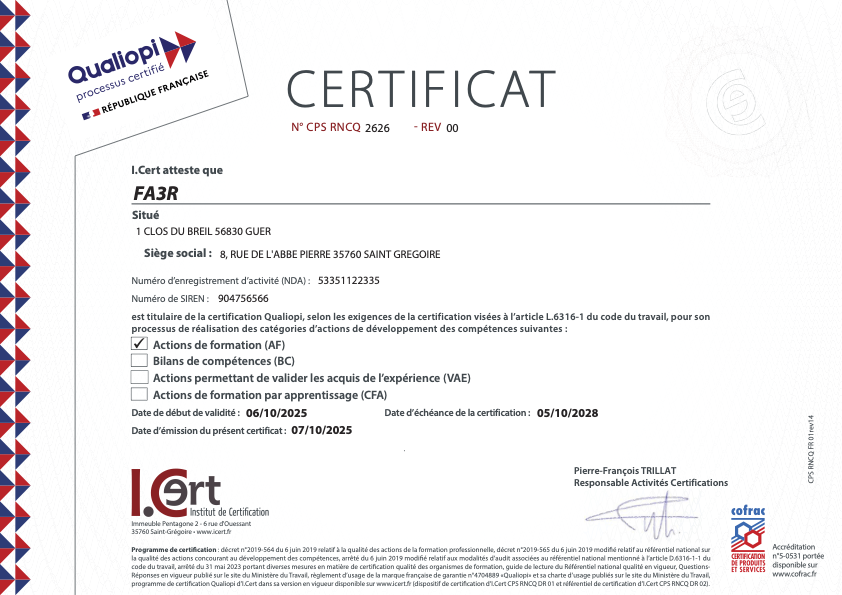 Cette certification atteste de la qualité de nos formations et de notre engagement à répondre aux exigences les plus strictes en matière de développement des compétences.